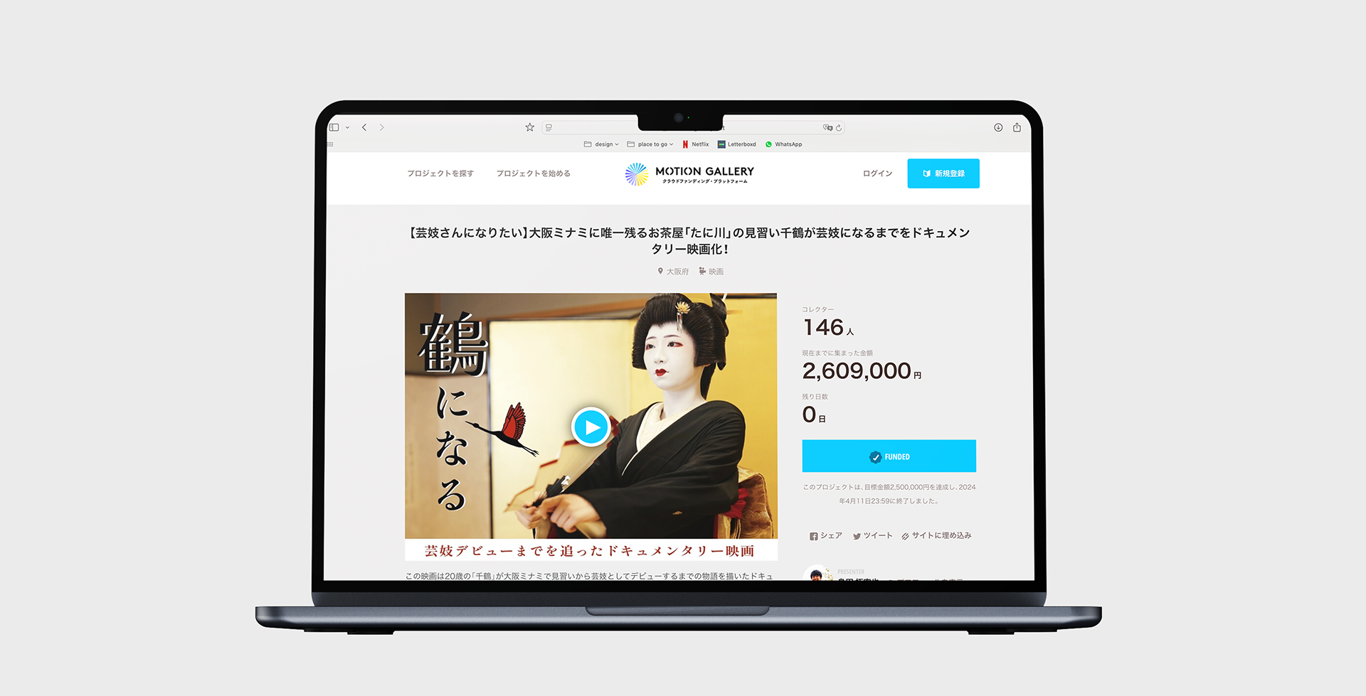 A striking and easily recognisable main visual of a geiko was chosen, as it would be seen by many who knew nothing about the film. To ensure clarity and impact, the title, an icon, and a brief description of the film were included. As a result, the production funding achieved 104% of its goal, raising approximately £16,900 for production.